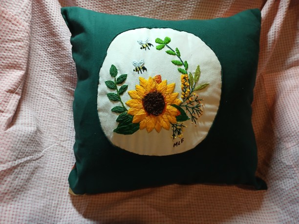 I hand embroidered the image from a pattern. I had to decide how the sunflower theme would be presented, Because of the individual who would receive my creation I decided to make a pillow instead of framing it, You see the exterior but the foundation, that which holds the pillows shape is the form that I made. This a gift may not be perfectly made but made with perfect love.